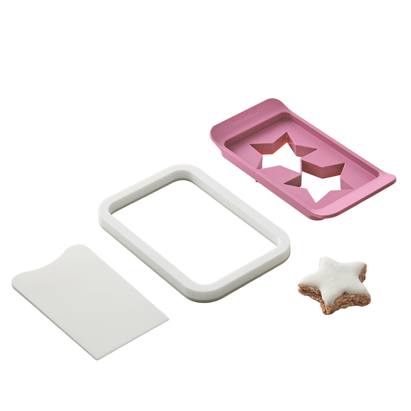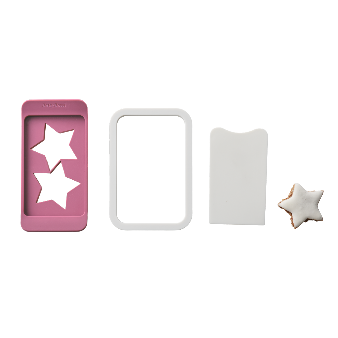 Mit dem Zimtsternen-Profi gelingen gleichmäßige Sterne mit perfekter Glasur – einfach, schnell und ohne Ankleben. Der Teig wird portionsweise in die Auswall-Hilfe gegeben und gleichmäßig ausgewallt. Anschließend stichst du mit dem Mehrfachausstecher zwei Sterne aufs Mal aus und trägst die Glasur mit dem Spachtel direkt über den Ausstecher auf – perfekt glasiert bis in die Spitzen.