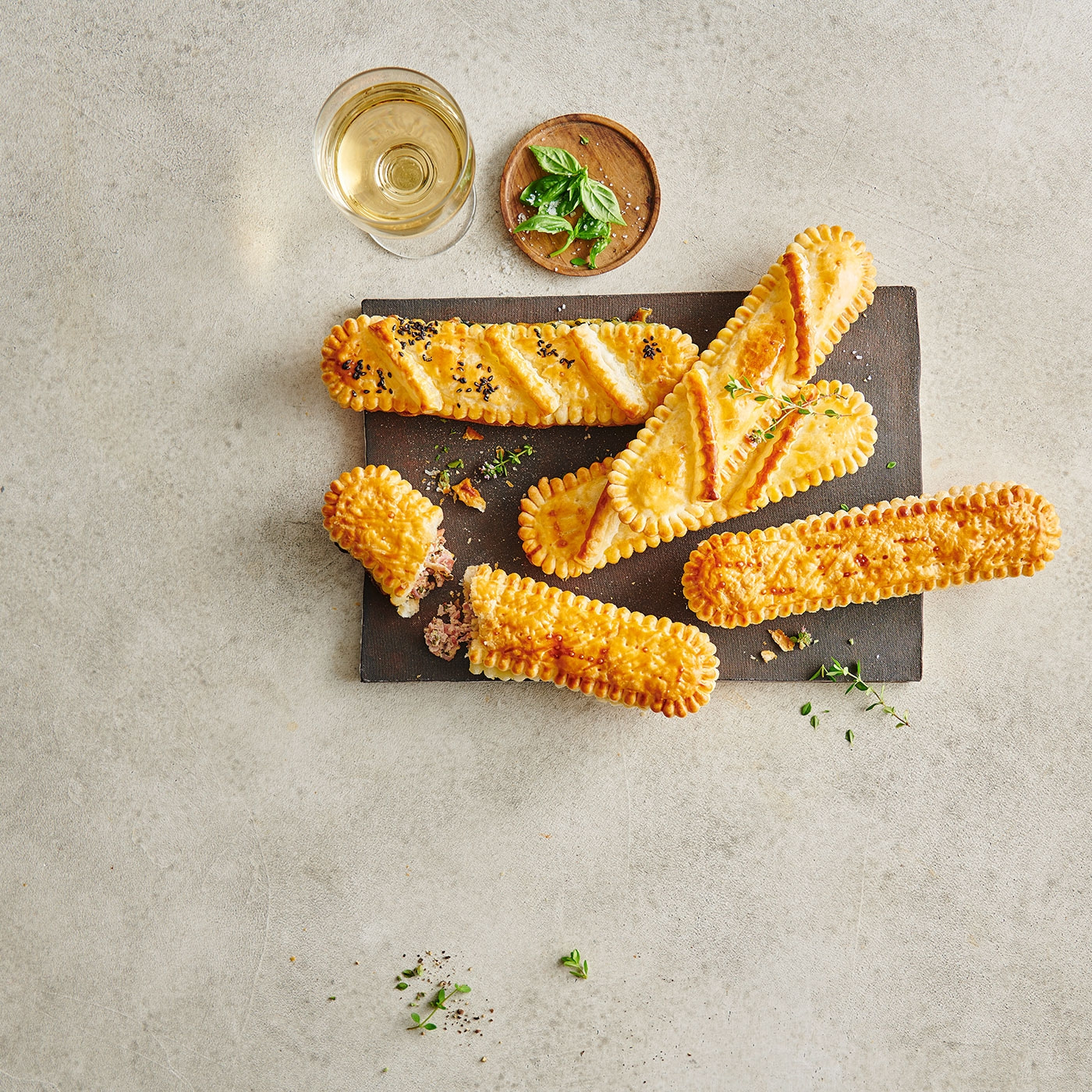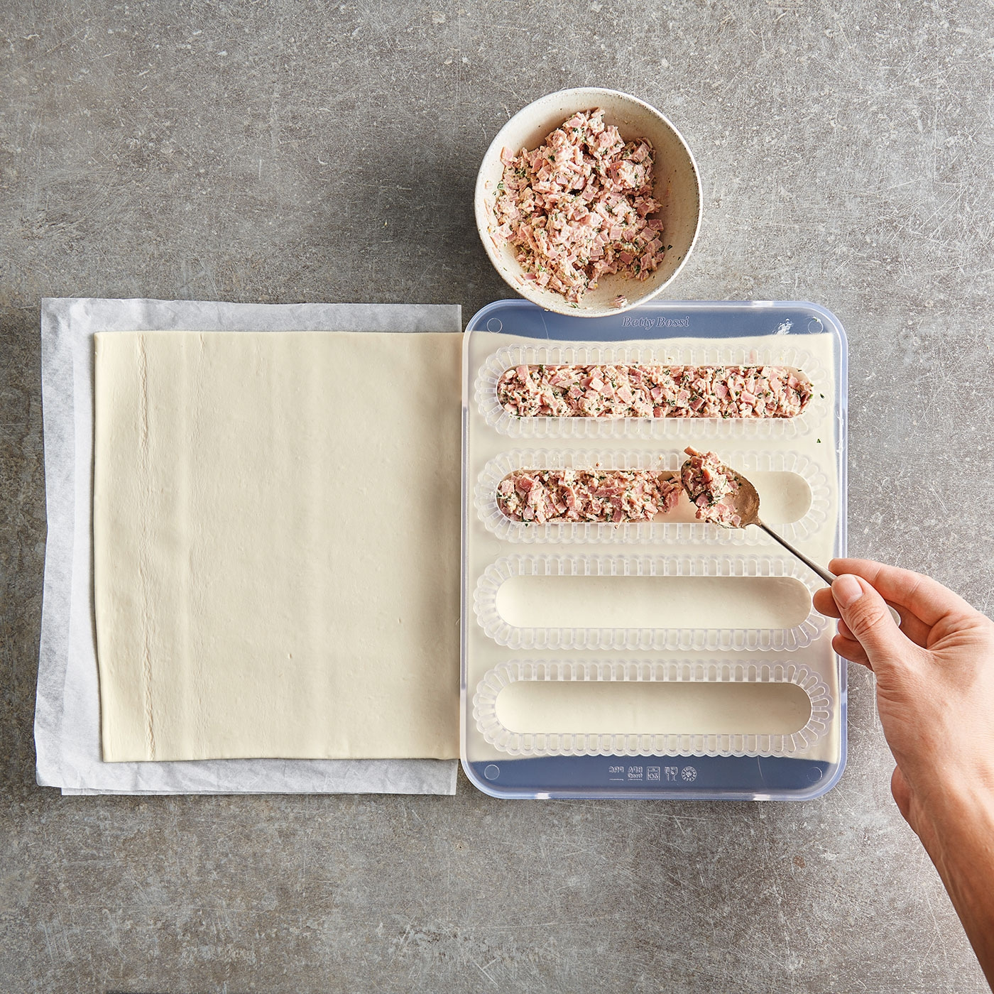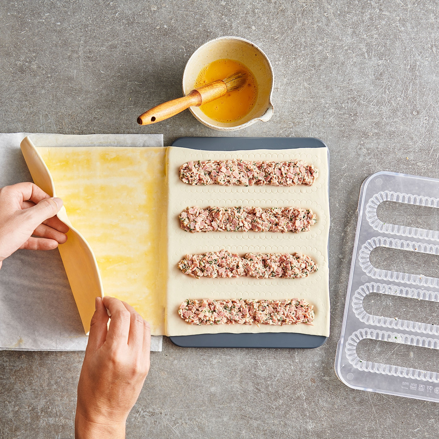Le set comprend deux plaques de cuisson antiadhésives ainsi qu’un gabarit adapté pour garnir et découper. Ce gabarit vous aide à remplir les bâtonnets feuilletés rapidement et avec précision, et à les découper avec un joli motif décoratif. Avec ce set, vous réussissez à la perfection vos bâtonnets au jambon, aux épinards ou des variantes sucrées comme les bâtonnets aux amandes. Le set est idéal pour les pâtes feuilletées rectangulaires prêtes à l’emploi – ce qui rend la préparation encore plus simple.
