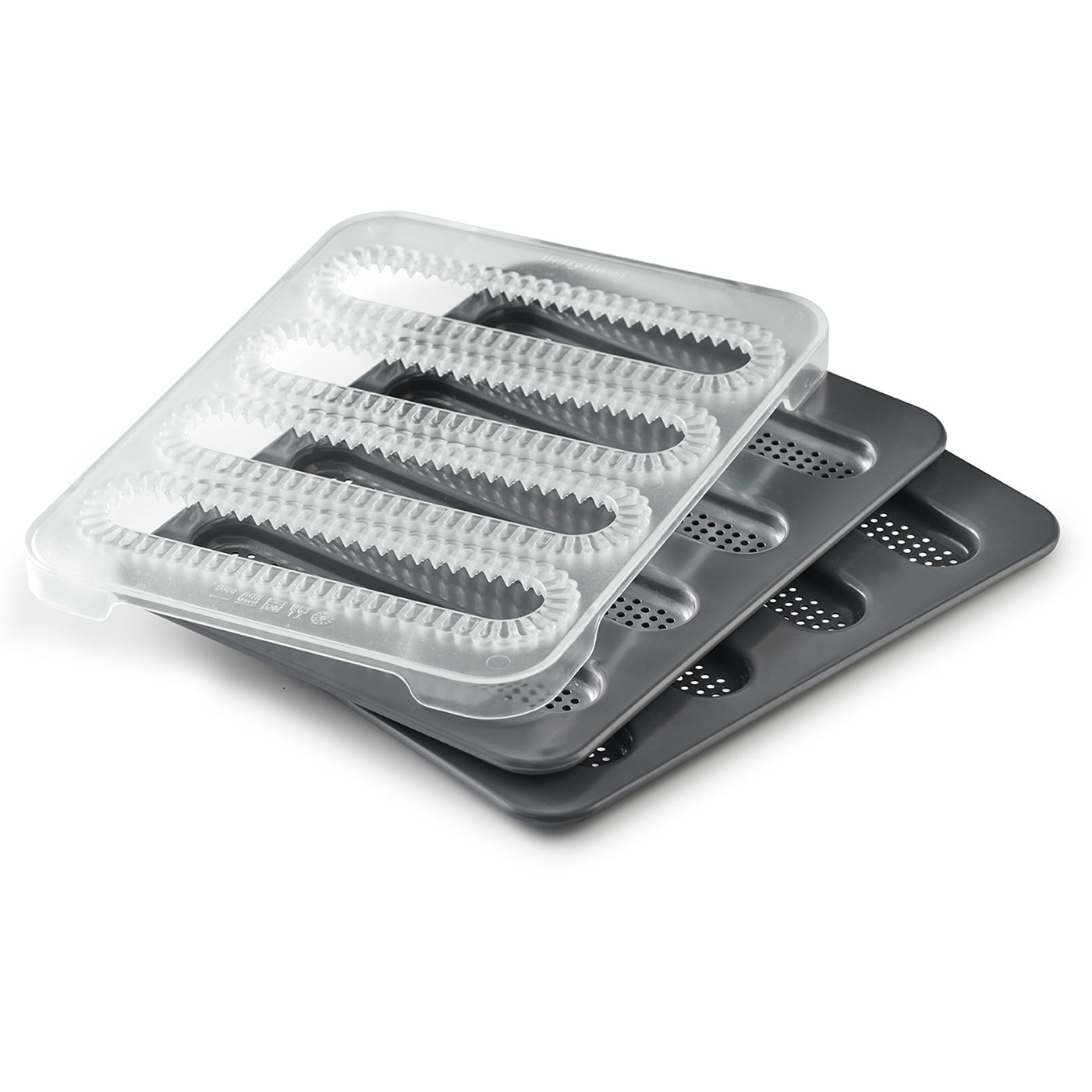 Les plaques de cuisson antiadhésives pour bâtonnets garantissent que vous puissiez détacher vos bâtonnets cuits sans effort. Avec le gabarit de découpe, vous travaillez proprement et efficacement : chaque bâtonnet contient une quantité de garniture uniforme et est automatiquement embossé d’un joli motif qui fera sensation au moment de servir. Vous obtenez un résultat professionnel, parfait pour le quotidien comme pour recevoir des invités.